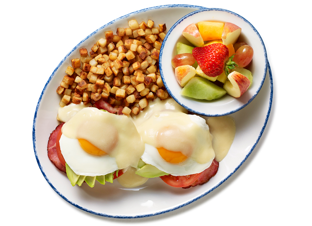Hash browns, mushroom, onion, green pepper and cheddar mixed with your choice of DeBakon*, ham, sausage, turkey bacon or veggies. Topped with hollandaise sauce and served with a bowl of mixed seasonal fruit.