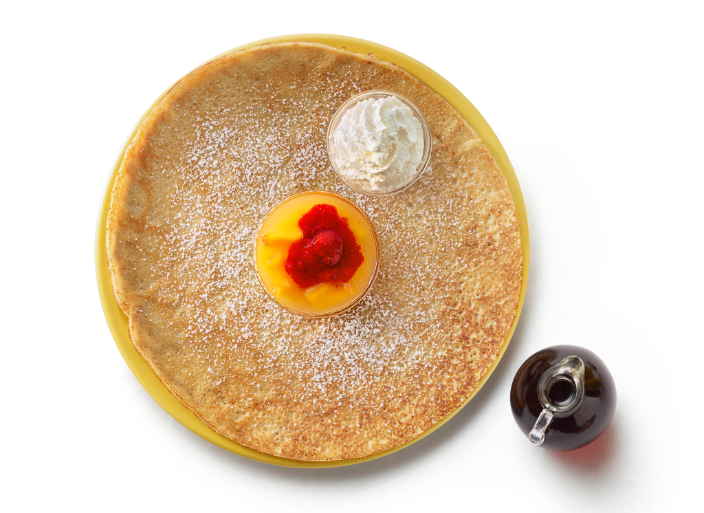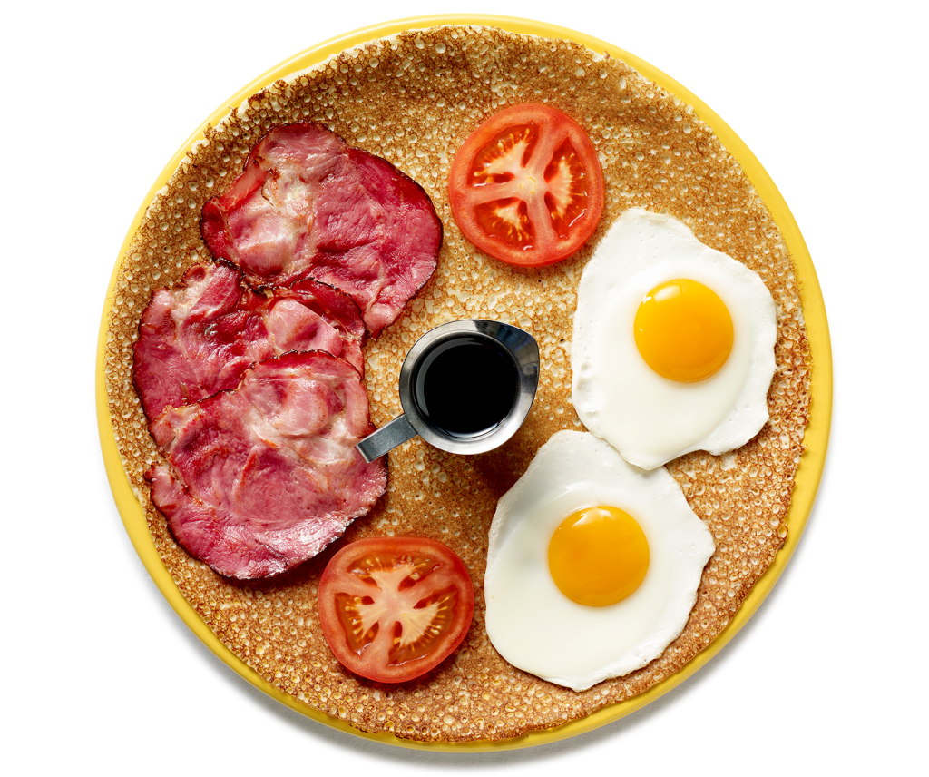 DeBakon*, ham, bratwurst, two eggs, hash browns and hollandaise sauce all on top of our classic pannekoek.